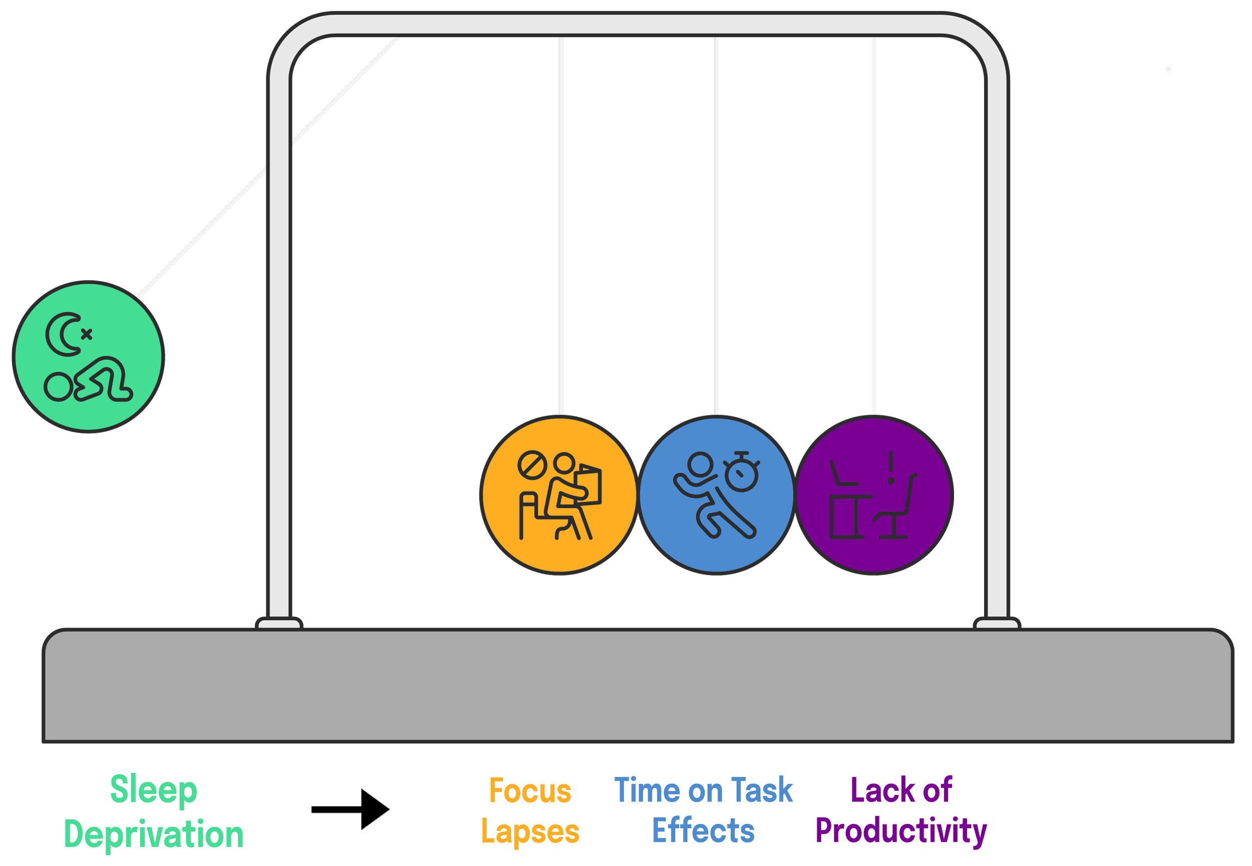 A study shows that sleep deprivation slows responses, increases focus lapses and errors, and heightens time-on-task effects, resulting in a lack of productivity.